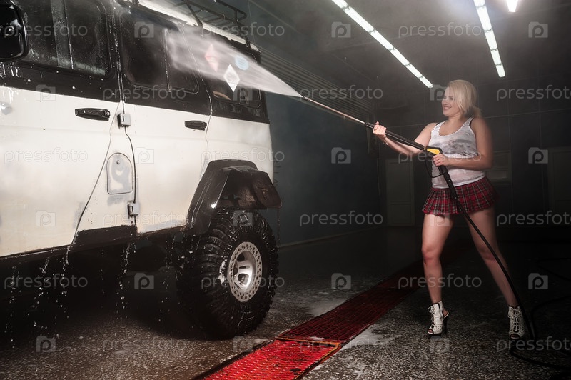 Сексуальная женщина моет машину