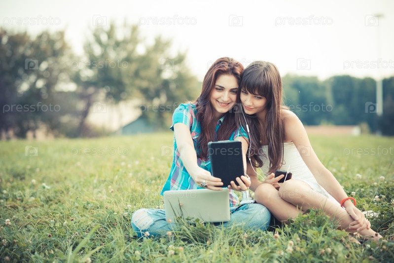 Две подруги с планшетом на поляне