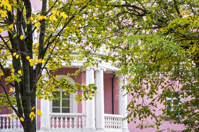 Балкончик дома с белыми колоннами среди деревьев