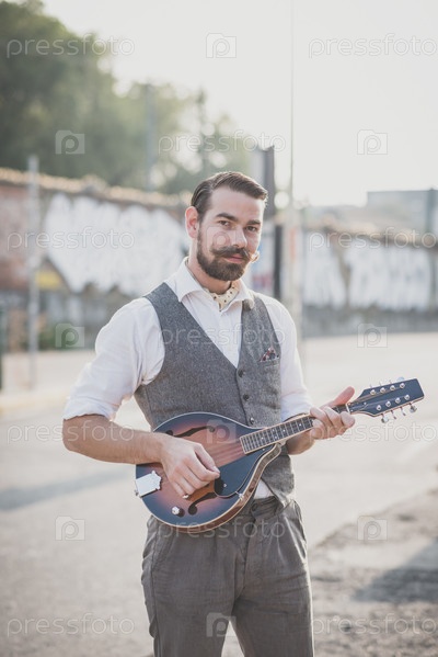 Красивый усатый хипстер играет на мандолине