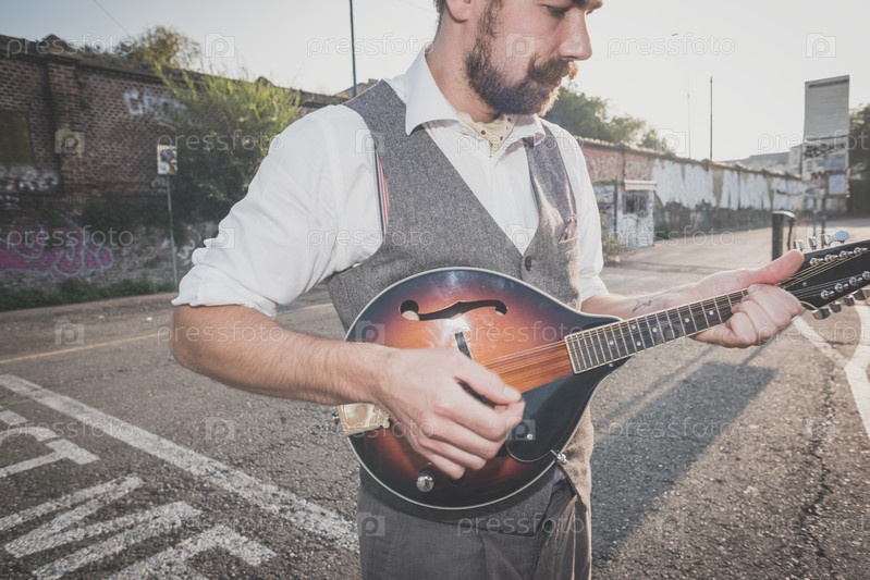 Красивый усатый хипстер играет на мандолине
