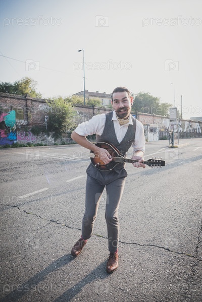 Красивый усатый хипстер играет на мандолине