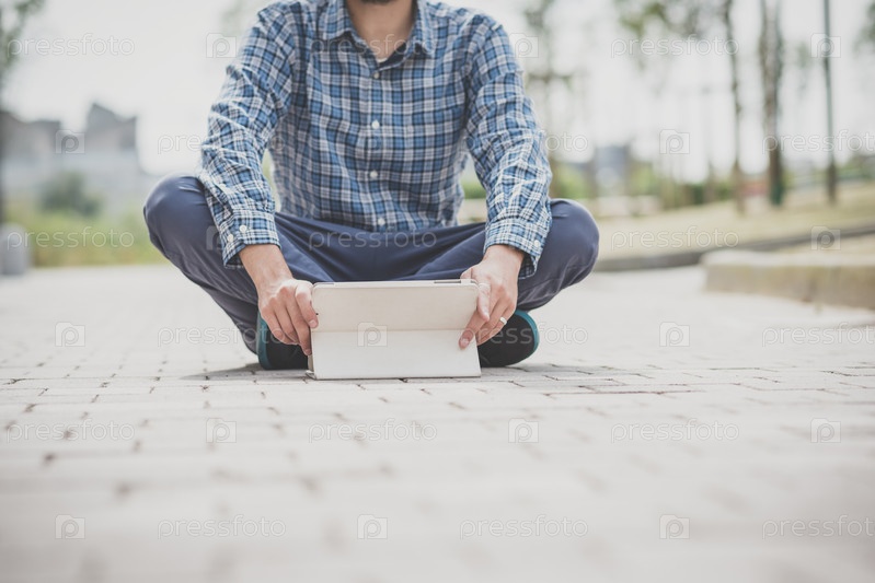 Красивый молодой мужчина-хипстер с планшетом