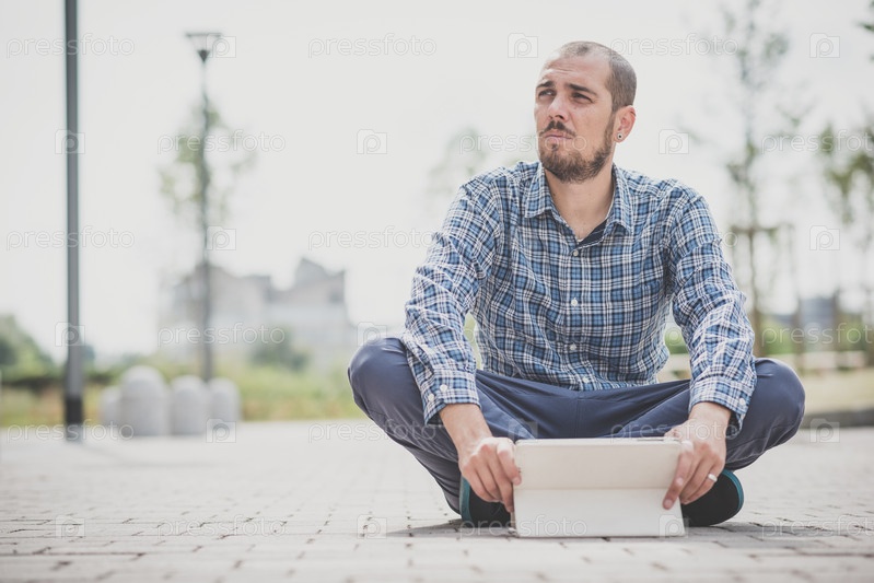 Красивый молодой мужчина-хипстер с планшетом