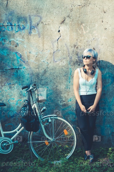 Молодая женщина-хипстер с наушниками и велосипедом
