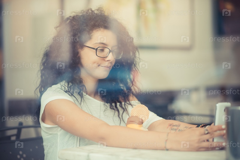 Молодая красивая женщина в кафе