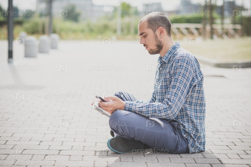 Хипстер с несколькими электронными устройствами