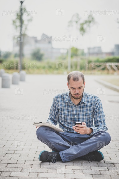 Хипстер с несколькими электронными устройствами