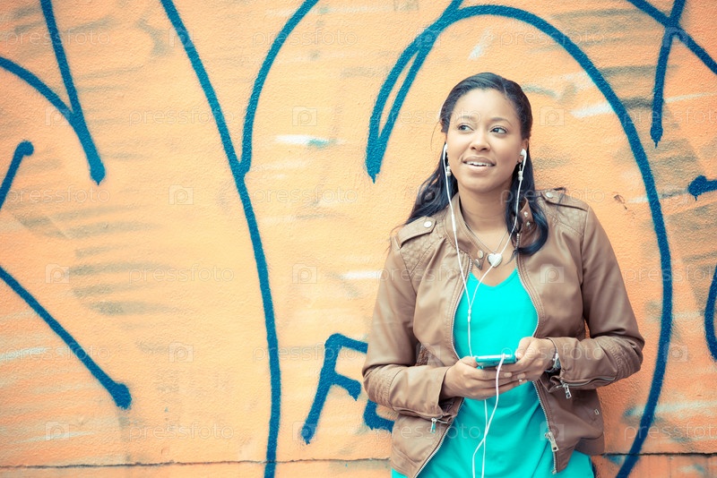Молодая женщина в наушниках на улице