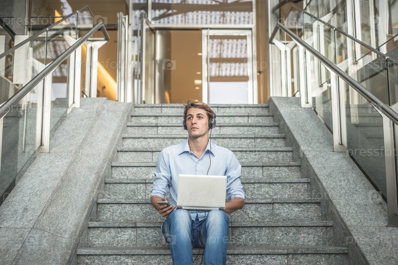 Молодой блондинк с наушниками и ноутбуком