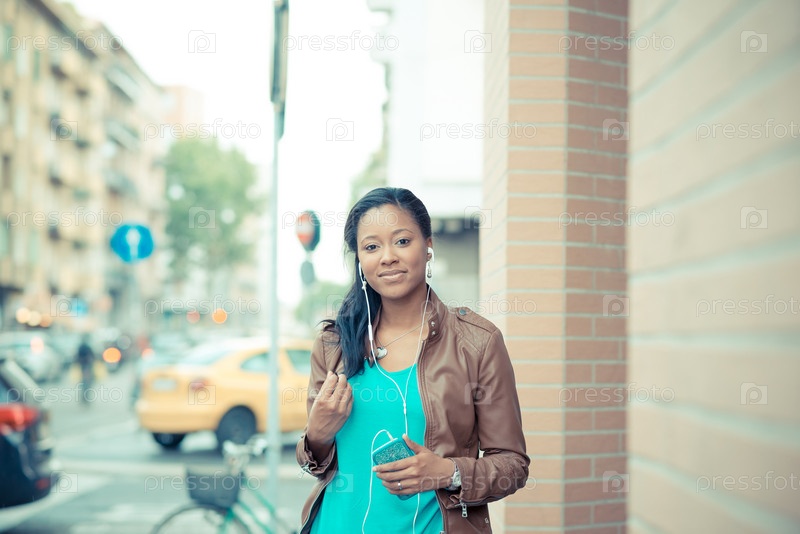 Молодая женщина в наушниках на улице