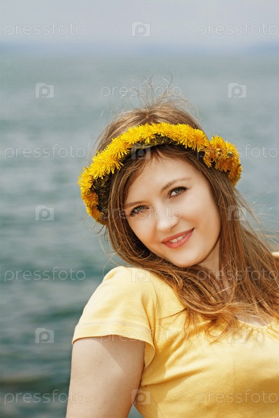 Портрет девушки с венком из одуванчиков на фоне моря