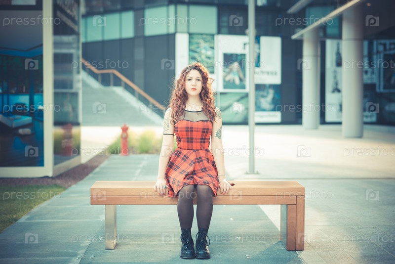 Молодая женщина с рыжими вьющимися волосами в городе