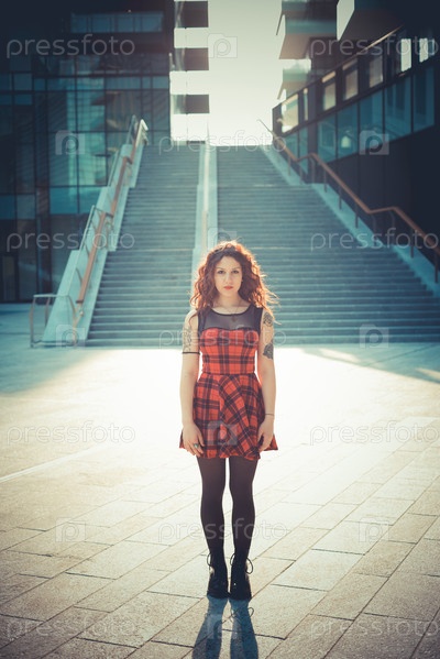 Молодая женщина с рыжими вьющимися волосами в городе