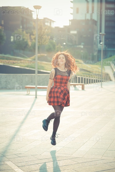 Женщина с рыжими вьющимися волосами в городе