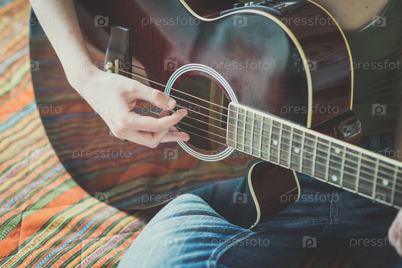Молодая женщина играет на гитаре