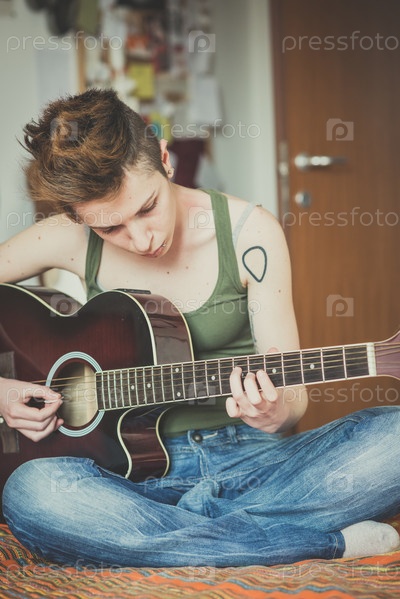 Молодая женщина играет на гитаре