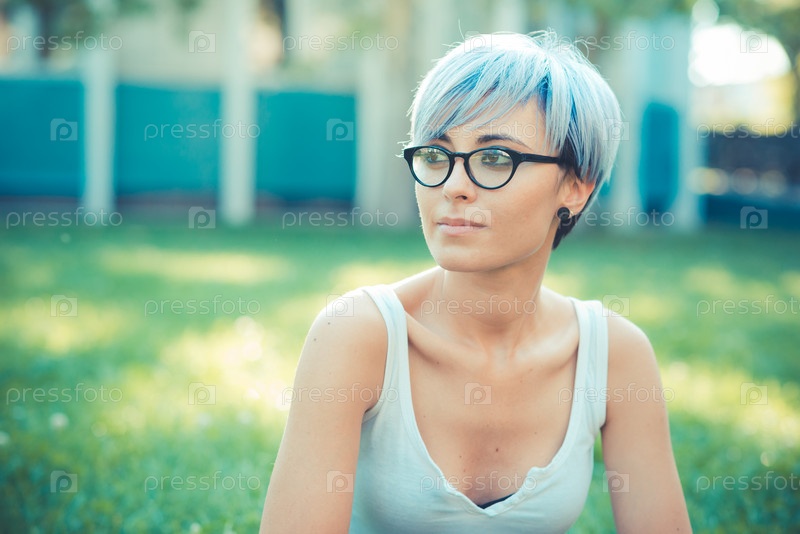 Молодая женщина с короткими синими волосами