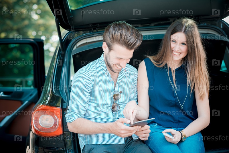 Молодая красивая пара с планшетом