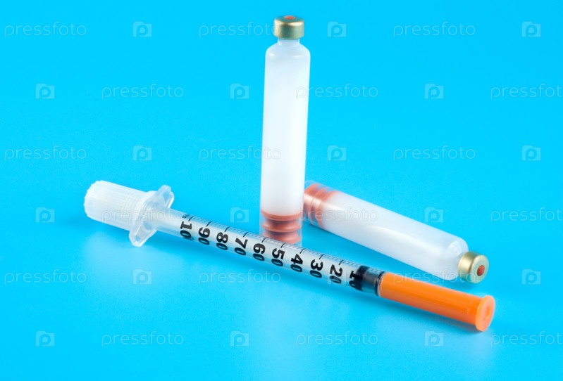 Шприц с инсулином и капсулы глюкозы на синем фоне