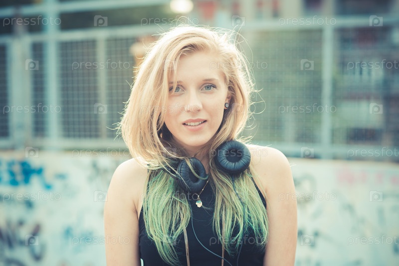 Красивая молодая блондинка слушает музыку