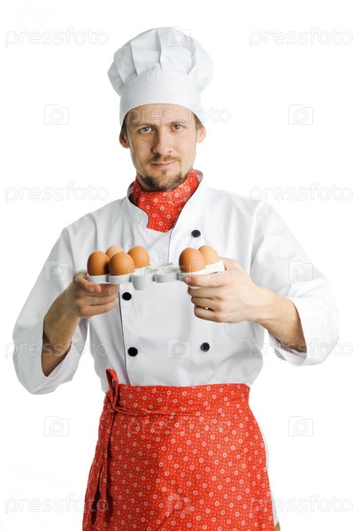 Шеф-повар держит тарелку яиц