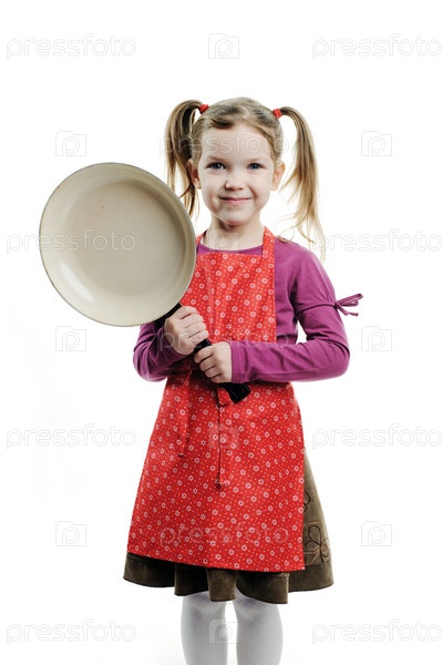 Маленькая девочка со сковородой на белом фоне