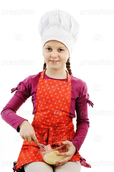 Маленькая девочка в колпаке повара на белом фоне
