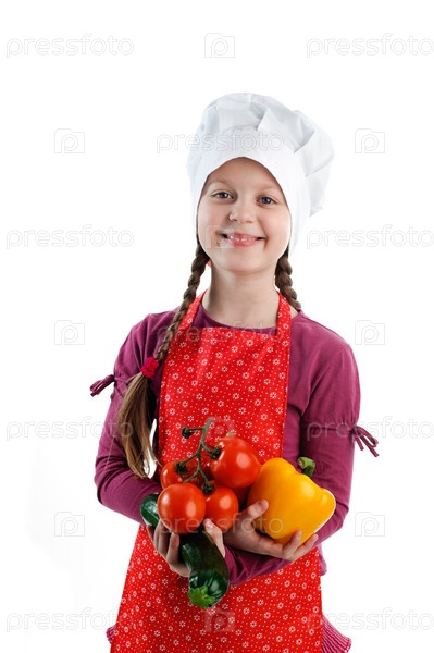 Маленькая девочка в колпаке повара на белом фоне