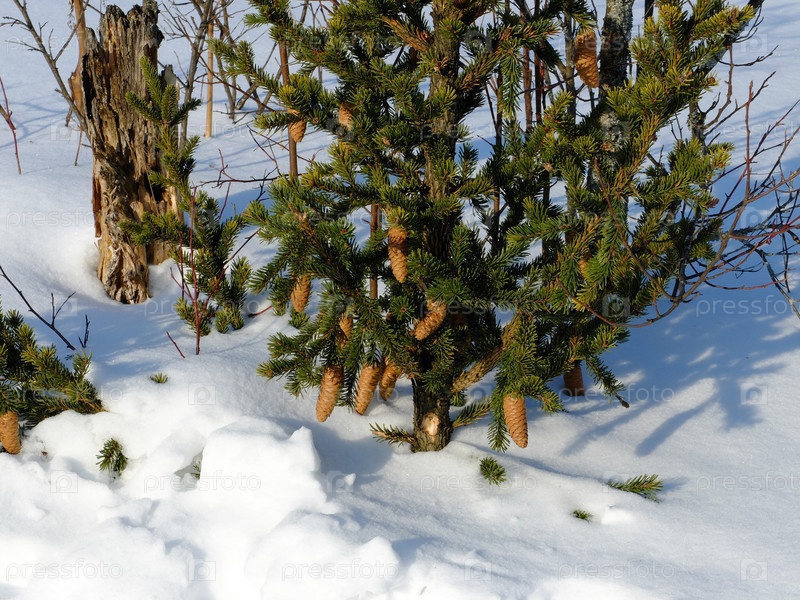 Маленькая ель с шишками на снегу