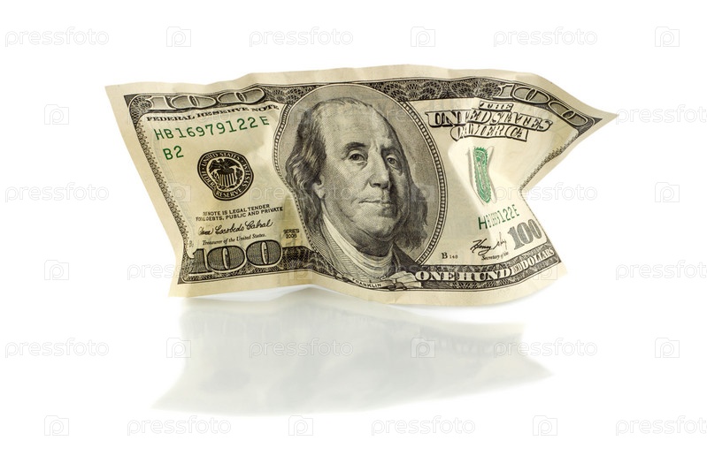 Смятая стодолларовая купюра на белом фоне