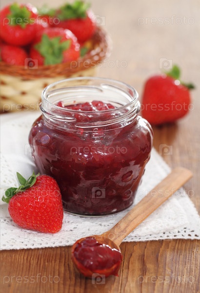 Свежая клубника и варенье в банке на столе