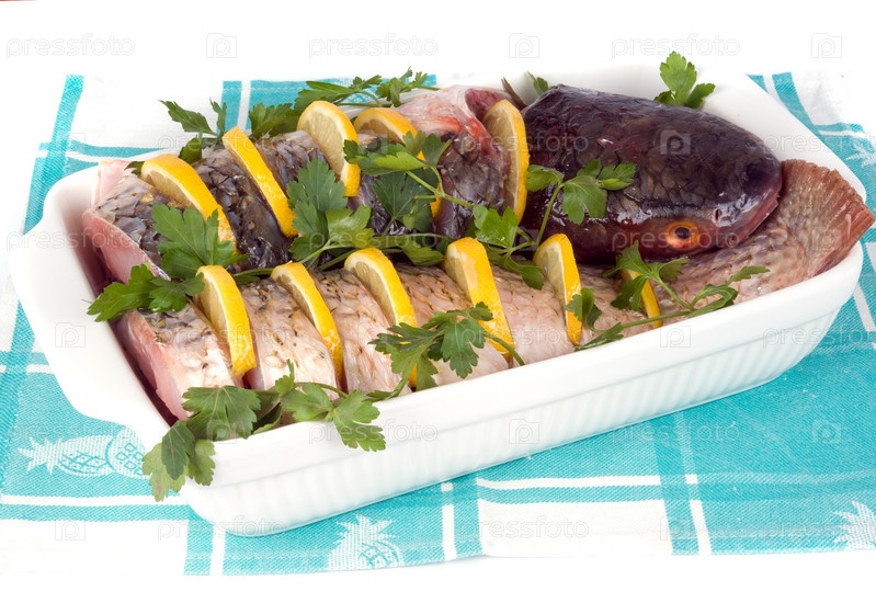 Кусочки свежей рыбы с зеленью и лимоном на противне перед запеканием