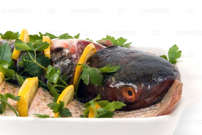 Кусочки свежей рыбы с зеленью и лимоном на противне перед запеканием