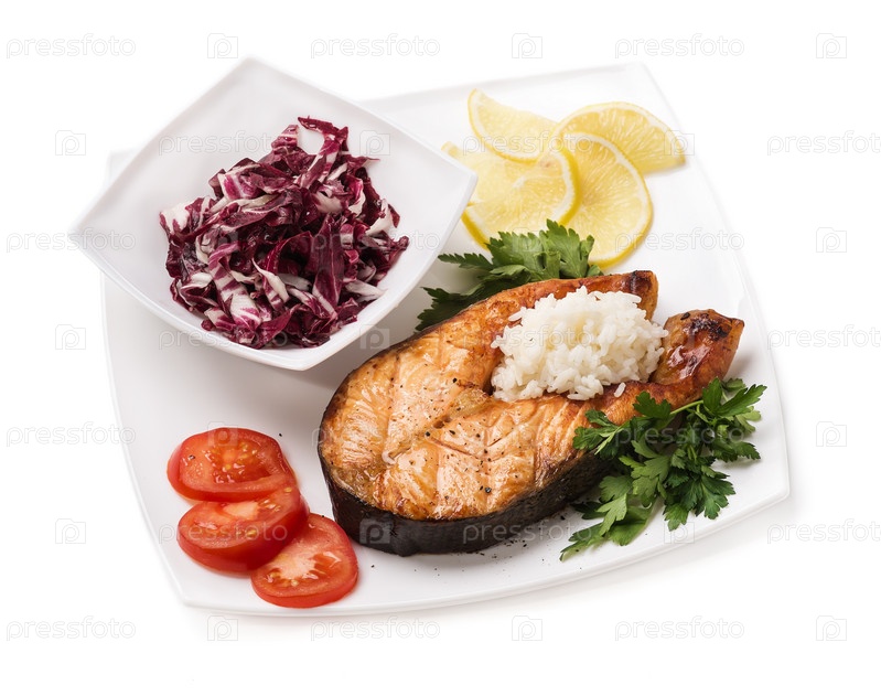 Форель с овощами и рисом на белом фоне