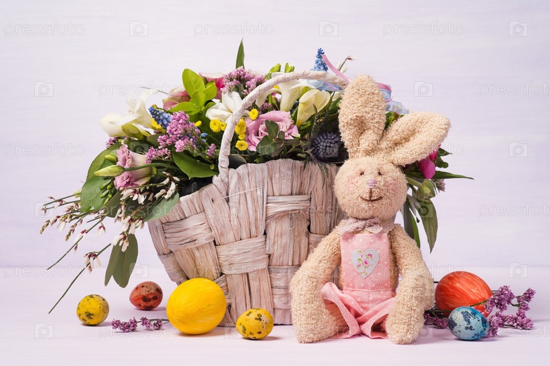 Корзина с декоративными цветами и красочные пасхальные яйца