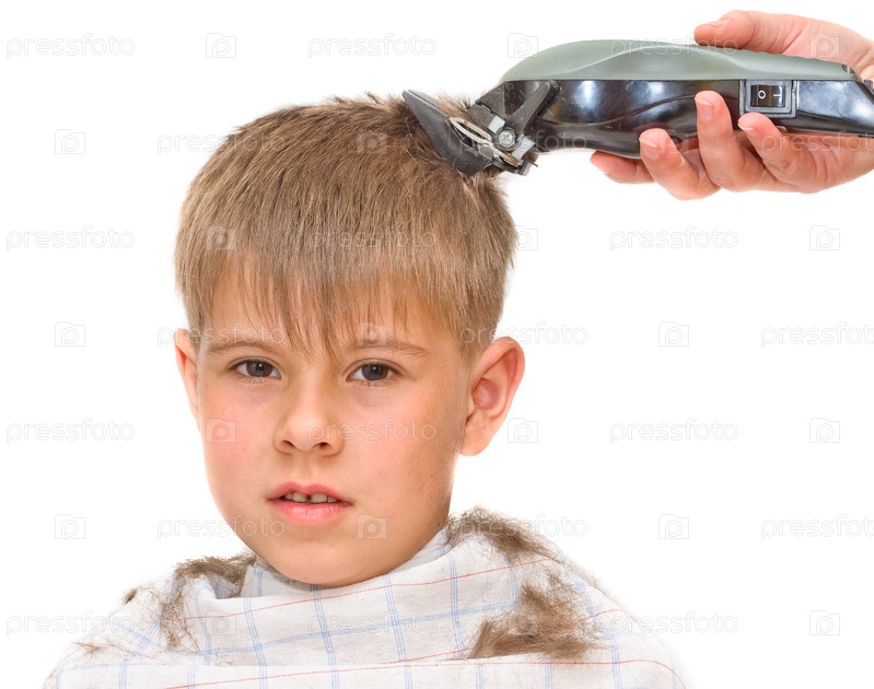 Рука парикмахера, стригущая мальчика