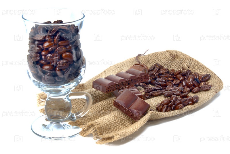 Шоколад, кофейные зерна в бокале и на мешковине на белом фоне