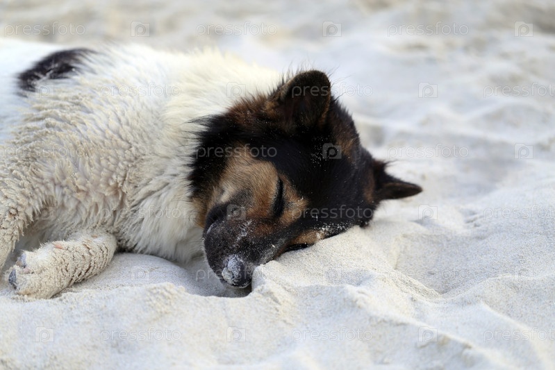 Собака лежит на песке