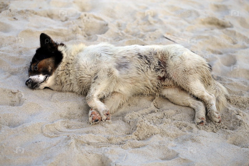 Собака лежит на песке