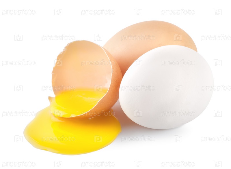 Разбитое сырое яйцо и целые яйца на белом фоне