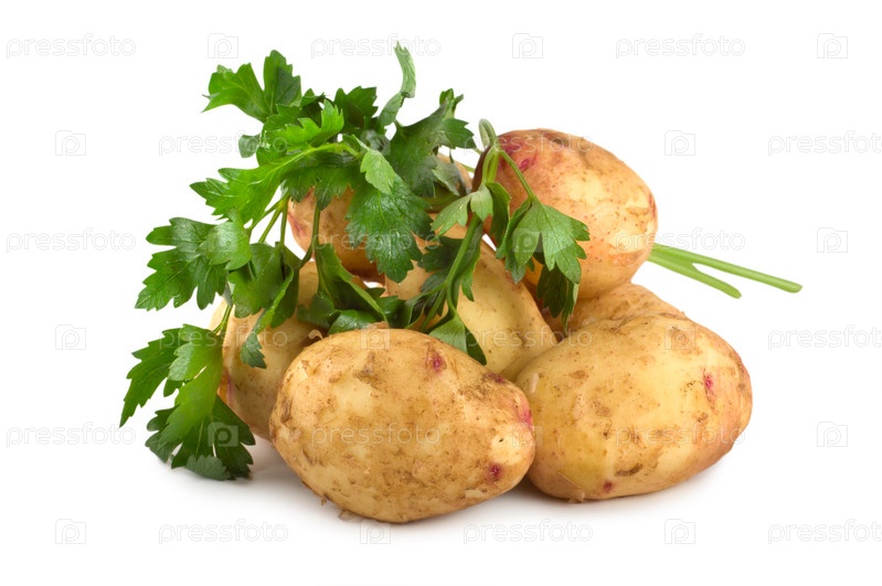 Сырой картофель и зелень петрушки на белом фоне