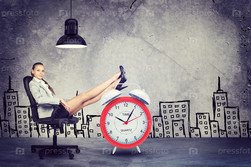 Бизнес-леди сидит, положив ноги на будильник