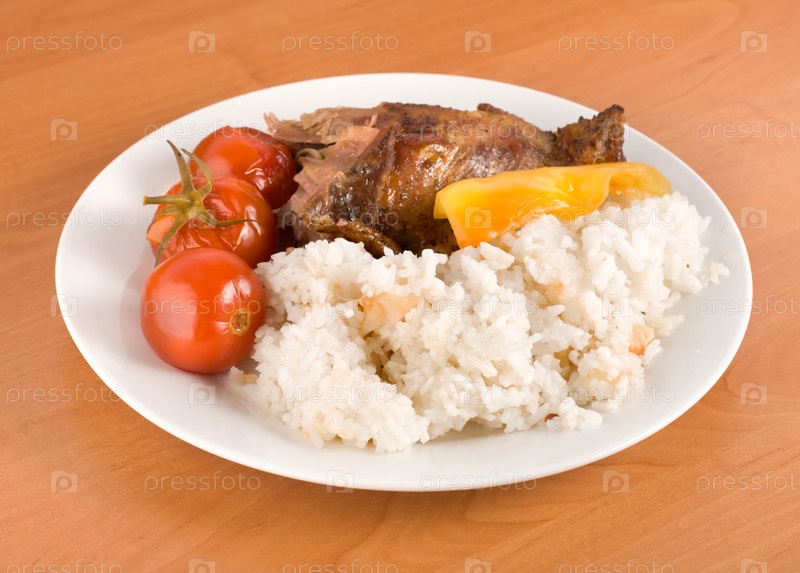 Вареный рис с жареной птицей на столе