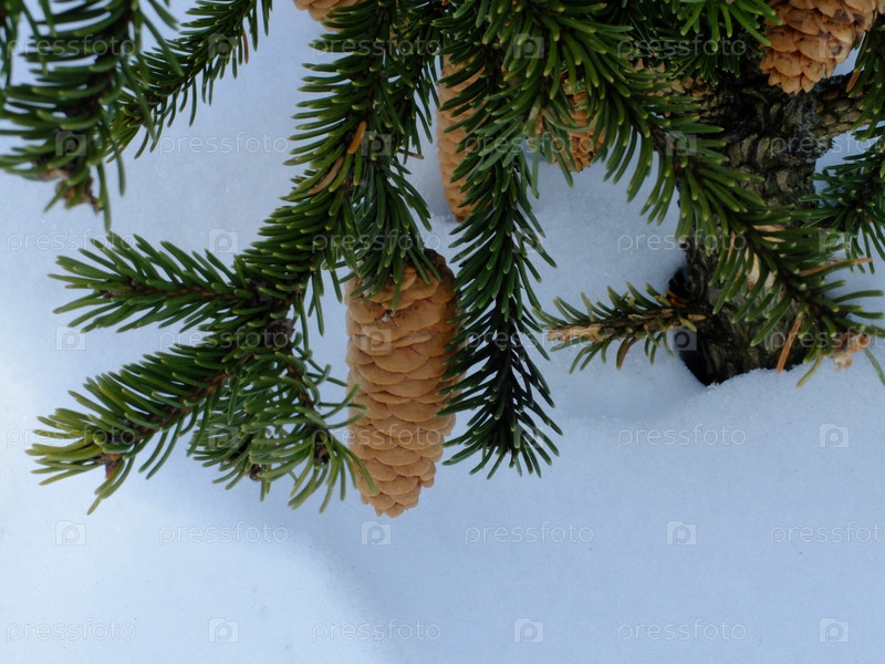Еловая ветка с шишкой на снегу