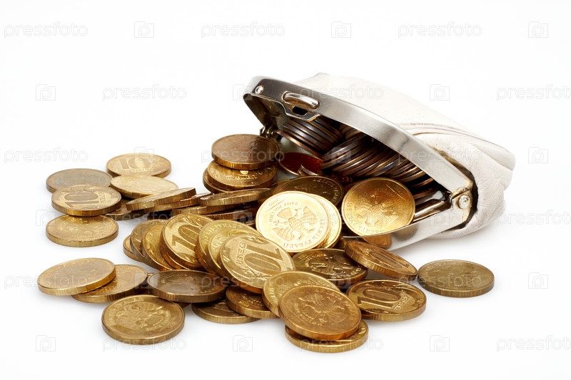 Открытый белый кошелек с монетами на белом фоне