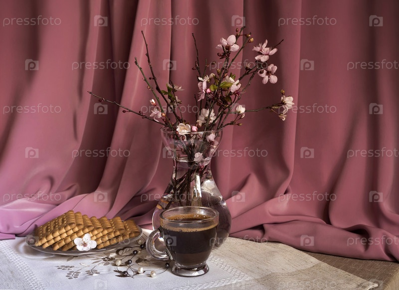 Натюрморт с цветущей веткой и кофе
