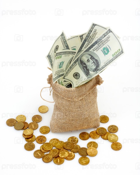 Мешочек с долларовыми купюрами и монетами на белом фоне