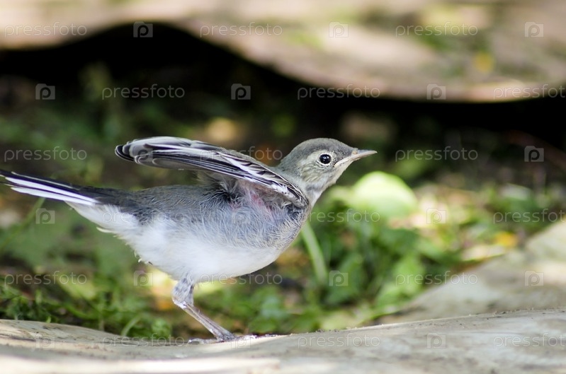 Птенец белой трясогузки пытается летать