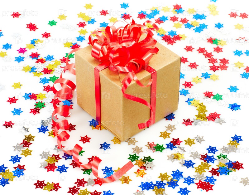 Подарочная коробочка с разноцветными конфетти на белом фоне